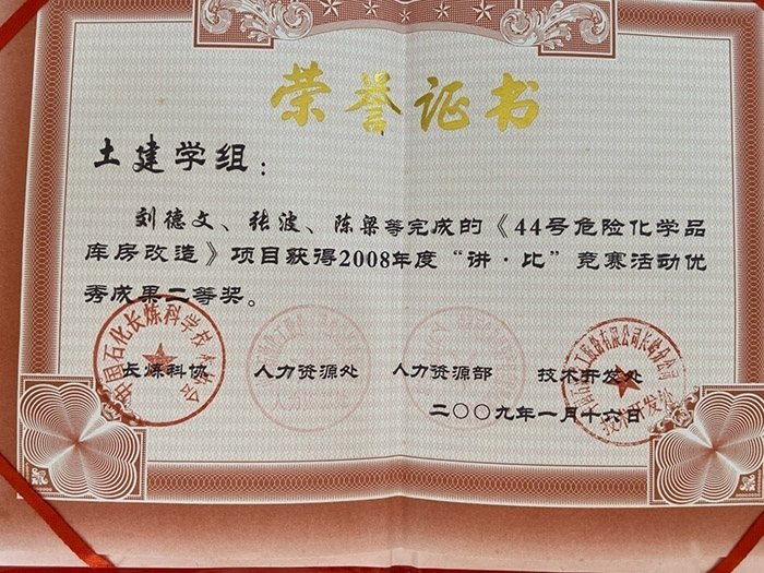 有驚無(wú)險(xiǎn),陳梁順利出院繼續(xù)工作,幾年時(shí)間他已經(jīng)成長(zhǎng)為公司優(yōu)秀的設(shè)計(jì)人員,完成了很多重大項(xiàng)目的結(jié)構(gòu)專業(yè)設(shè)計(jì)。其中,他參與的“催化劑齊魯分公司5萬(wàn)噸/年裂化催化劑聯(lián)合生產(chǎn)裝置”獲中石化優(yōu)秀設(shè)計(jì)二等獎(jiǎng),“裂化催化劑制備大型化工程技術(shù)”獲得中國(guó)石油和化工勘察設(shè)計(jì)協(xié)會(huì)的專有技術(shù),“中石化催化劑大連基地建設(shè)項(xiàng)目”獲得了中石化優(yōu)質(zhì)工程獎(jiǎng)。設(shè)計(jì)之余,他還在《低碳世界和建筑裝飾》刊物上發(fā)表了《氫氣壓縮機(jī)廠房結(jié)構(gòu)設(shè)計(jì)要點(diǎn)》和《CFG樁復(fù)合地基加固儲(chǔ)罐地基實(shí)例》等頗具影響力的論文;他刊登在《長(zhǎng)煉科技》上的文章《危險(xiǎn)化學(xué)品庫(kù)房改造要點(diǎn)》獲得長(zhǎng)嶺科技一等獎(jiǎng)。
