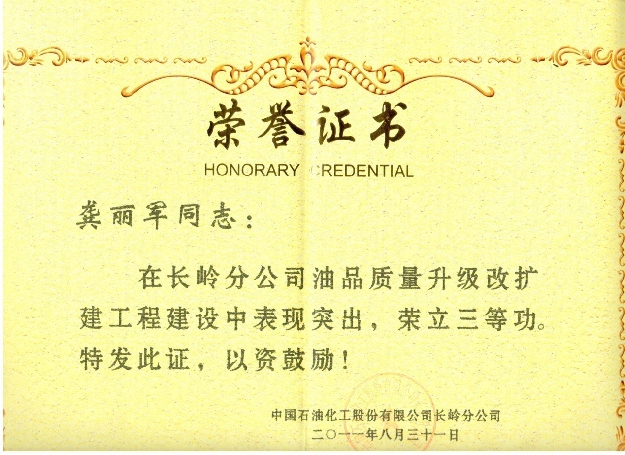 成功與進取同行,收獲與耕耘同在。兩岸曉煙楊柳綠,一園春雨杏花紅。“湖南省重大建設項目投資統(tǒng)計先進工作者”,長煉大項目建設三等功獲得者,參與的蘭精(南京)纖維有限公司10萬噸/年硫酸裝置2008年獲中國勘察設計協(xié)會工程總包項目銅鑰匙獎,2013年長嶺煉化公司優(yōu)秀黨員,2019年度長嶺煉化公司優(yōu)秀員工……在外人看來,龔麗軍碩果累累。在她自己眼中,她是女兒,是妻子,是母親,但她更多時候,是一位心中有原則、人生有追求的“老工”。