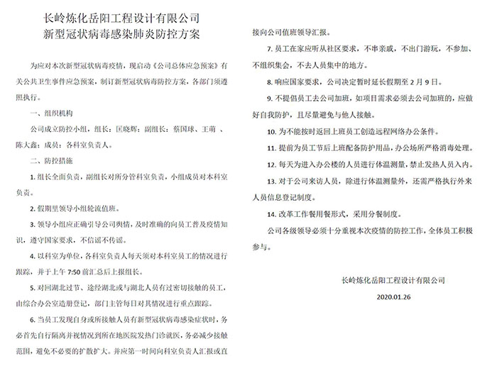 2020鼠年的春節(jié),一場新型冠狀病毒從九省通衢的武漢席卷華夏大地。湘楚一家結(jié)合部的岳陽突處“抗疫”前線,形勢異常嚴峻。長嶺煉化岳陽工程設計有限公司快速反應、及早準備、精心部署、上下同心,一切為了員工健康,確保相關(guān)工作有序開展。是謂:抗擊疫情有靜氣,不信東風喚不回。