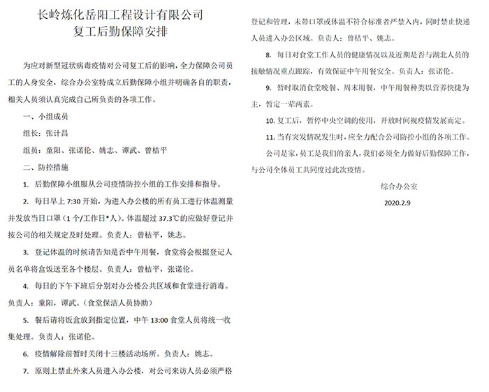 為滿足工程設計項目進度要求,公司一手抓“新冠疫情”防控,一手抓員工有序復工。為了做好復工后的后勤保障工作,綜合辦公室于2月5日就起草了《公司復工后勤保障安排》,幾經(jīng)修改,于2月9日確定最終版。