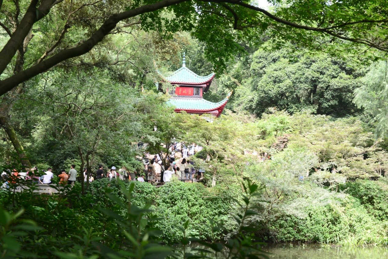 徘徊愛晚亭,游人如織;盛夏濃陰下,心靜自涼。雖然不是深秋,看不到火紅的楓葉,但仍然是“停車坐愛楓林晚”,綠樹山風勝清涼。當年,毛澤東、蔡和森等新民學會的會員們常聚集在此,櫛風沐雨、鍛煉體魄,研學求真、交友求理,苦苦地尋找救國拯民、振興中華的道路。
