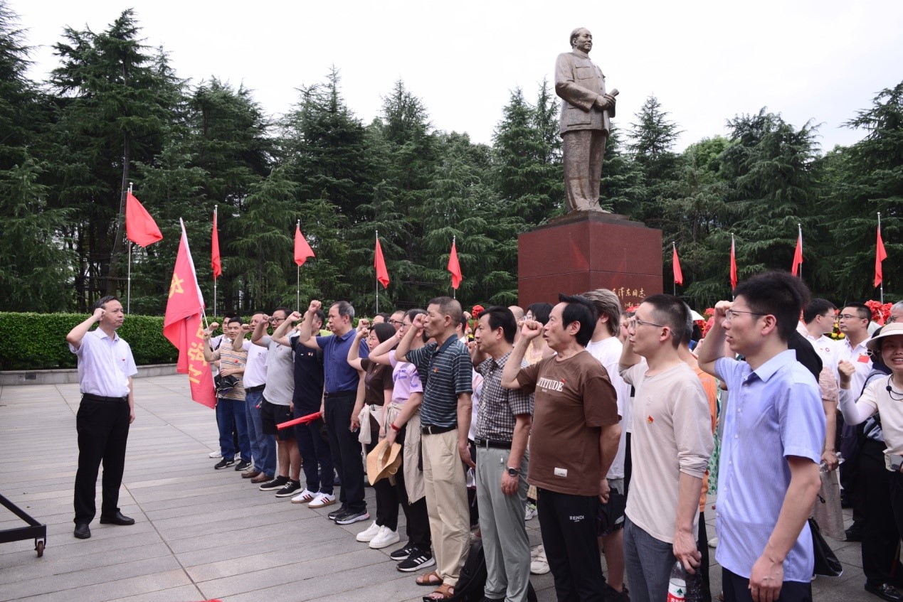 在銅像廣場左側(cè),我們列隊莊嚴地舉起右手,在匡曉輝同志的領誓下,重溫入黨誓詞:“我志愿加入中國共產(chǎn)黨……”。鏗鏘有力的誓言回蕩在蒼松翠柏圍繞的廣場里,也回蕩在大家熾熱的心中。“為有犧牲多壯志,敢叫日月?lián)Q新天”的韶山精神,再一次得到學習體悟。