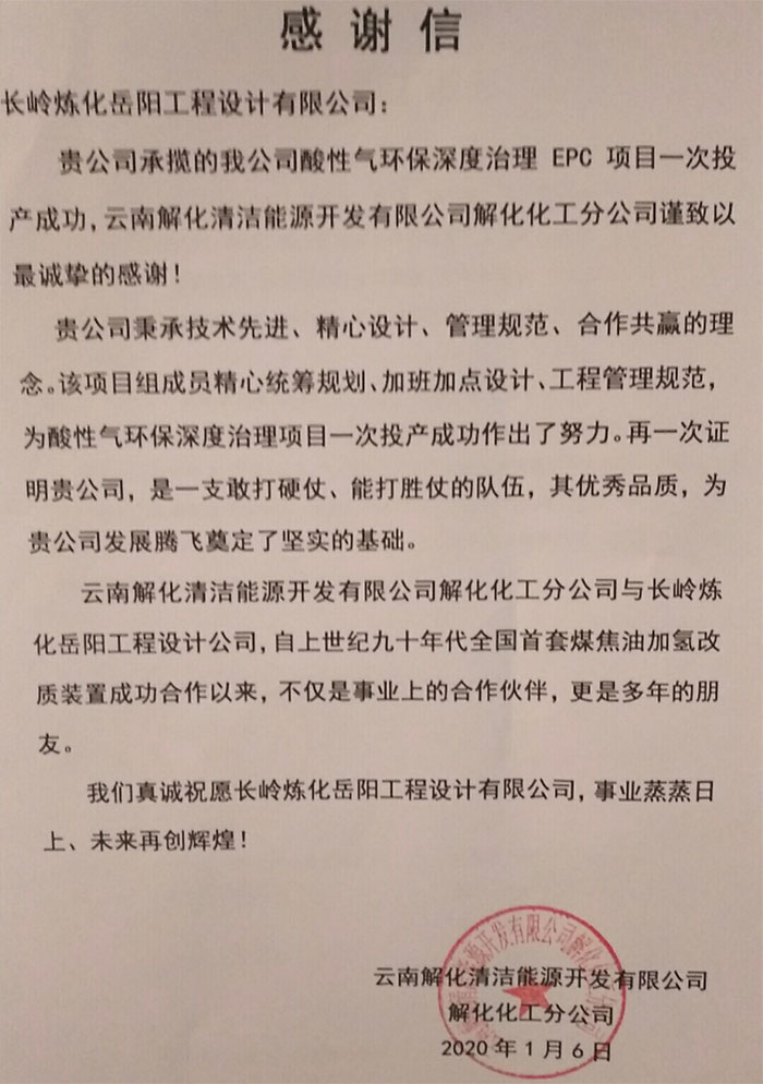新年伊始,捷報頻傳。2020年1月5日從云南省開遠市傳來喜訊:由公司牽頭承攬的《云南解化清潔能源開發(fā)有限公司解化化工分公司酸性氣環(huán)保深度治理項目》EPC聯(lián)合總承包一次投產(chǎn)成功,產(chǎn)品及各項環(huán)保指標全部合格!
