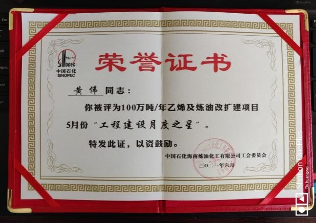 經(jīng)過海煉項(xiàng)目部全體人員的共同努力,在5月份中石化海南煉化乙烯項(xiàng)目EPC單位安全、質(zhì)量、進(jìn)度等綜合評(píng)比中,我公司獲得第一名的好成績(jī)。6月9日,中石化海南煉化公司副總經(jīng)理謝維新親自給項(xiàng)目部代表?xiàng)罨肿款C發(fā)了鮮艷的錦旗。同時(shí)黃偉同志在建設(shè)單位HSSE單項(xiàng)評(píng)比中獨(dú)占鰲頭,獲得“工程建設(shè)月度之星”殊榮。
