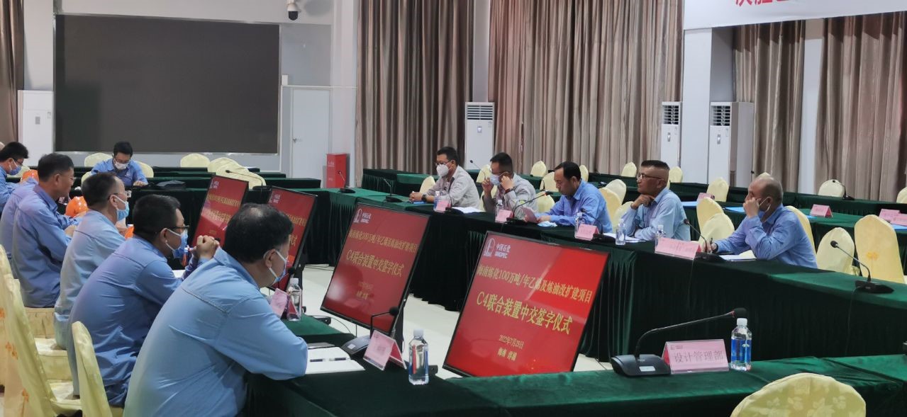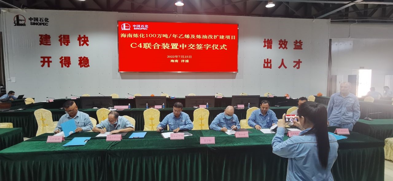 2022年7月25日上午11時8分,在眾首期盼中,我公司海南煉化乙烯C4聯合裝置EPC總承包項目迎來高標準中交的幸福時刻。簽字儀式在海南煉化乙烯項目最大的會議中心舉行。